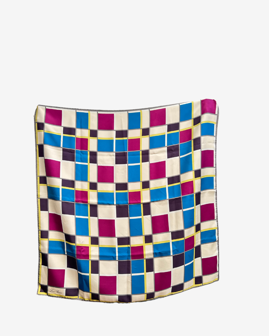 Pañuelo cuadrado de Loro Piana, confeccionado en 100% seda, con diseño geométrico en bloques de color fucsia, azul, amarillo y burdeos sobre fondo marfil. Esta pieza fue producida en los años 2000, periodo en el que la marca italiana consolidó su reputación como sinónimo de lujo discreto y materiales de la más alta calidad. El pañuelo representa la combinación perfecta de artesanía y modernidad, convirtiéndose en un accesorio vintage high-end atemporal.