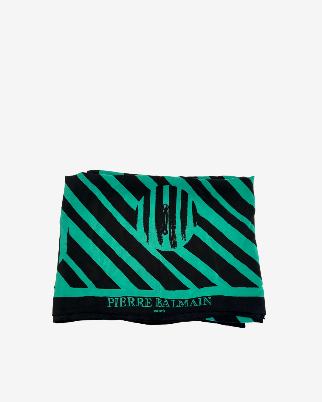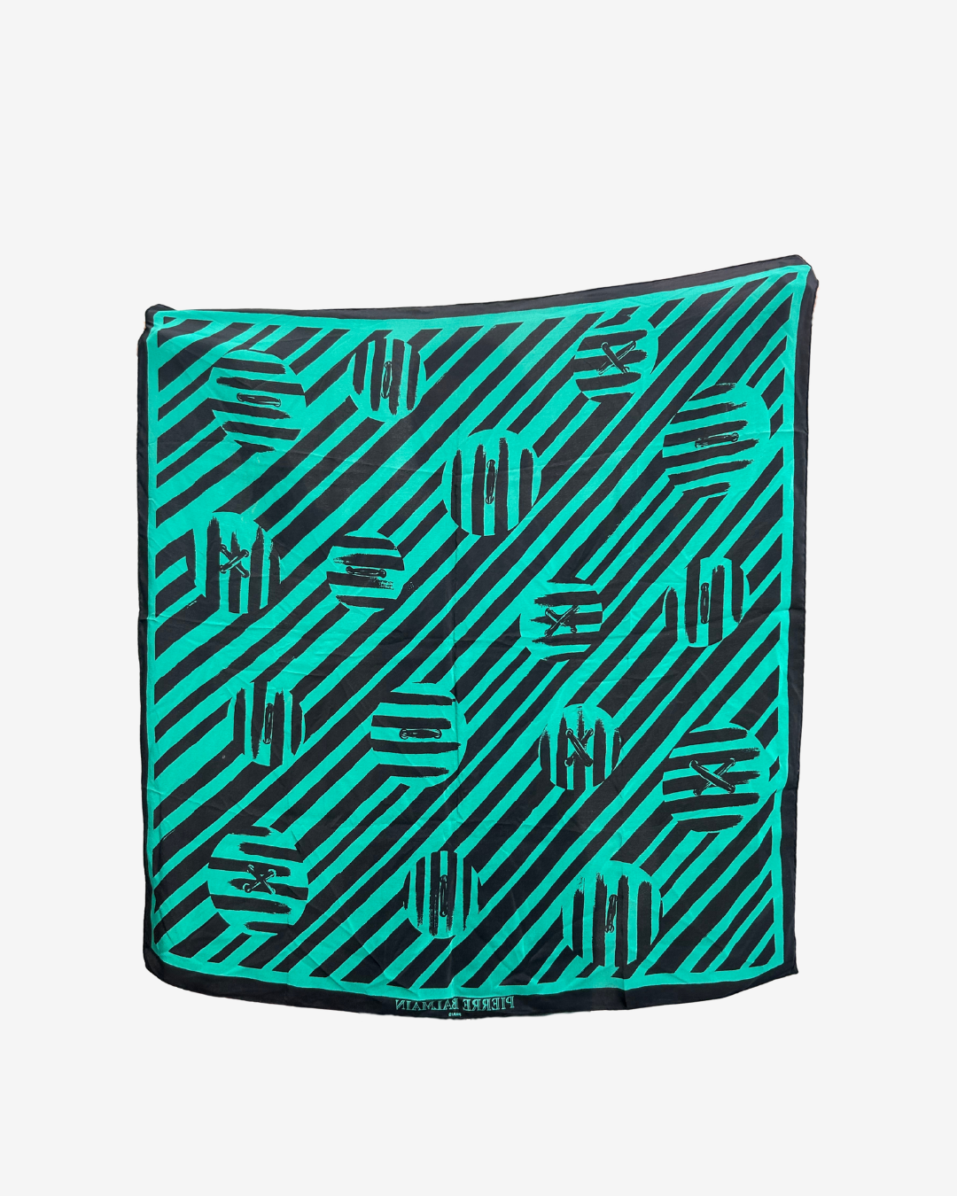 Pañuelo cuadrado de Pierre Balmain Paris, confeccionado en 100% seda, con estampado geométrico en verde esmeralda y negro con logotipo repetido. Esta pieza fue producida en los años 80, una década en la que Balmain experimentó con gráficos más atrevidos y diseños llamativos en sus accesorios. Hoy es considerado vintage high-end, apreciado por coleccionistas y amantes de la moda parisina clásica con un giro contemporáneo.